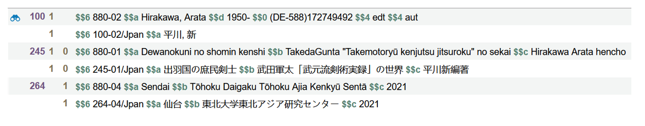 880 Originalschrift (Andersschriftliche Darstellung)) abgebildet: Jedes Feld (z.B. 100, 245, 264,…), das einen zusätzlichen Eintrag in Originalschrift erhält, wird mit diesem über $$6 verknüpft. 880 würde bei manueller Eingabe verwendet werden, "verschwindet" aber beim Speichern. Der Feldinhalt wird angezeigt, die Feldnummer 880 aber nicht.